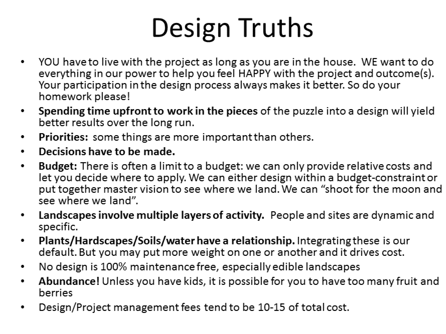 “It is said 5 minutes of planning is worth 15 minutes of doing". With landscape design and growing food, 5 minutes of planning is worth dozens and dozens of hours of doing, and can save thousands of dollars and headaches”
